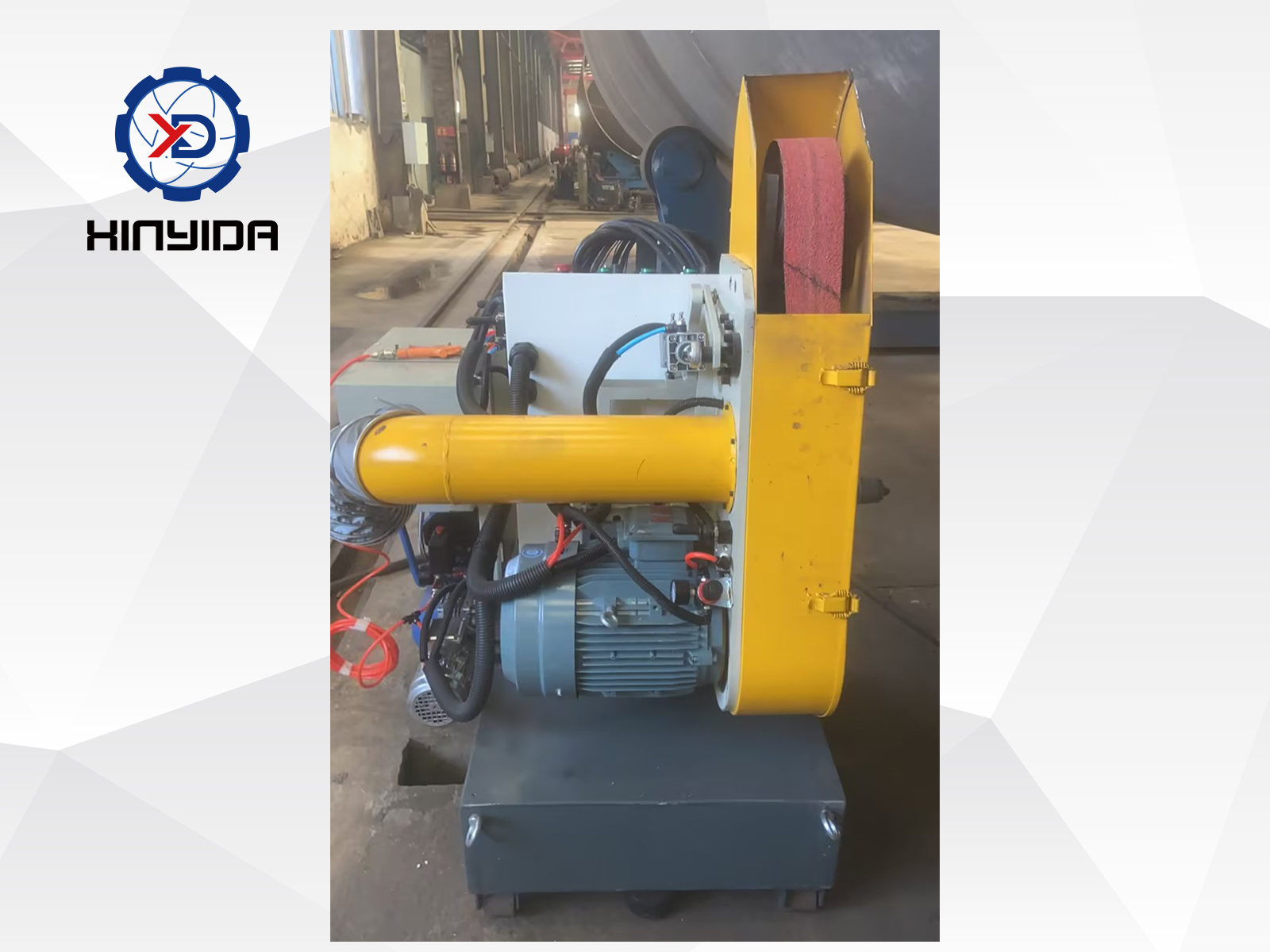 設(shè)備包括底框、底框行走輪組、打磨鎖緊機(jī)構(gòu)、磨頭(含砂帶組件和切割片組件)、左右行走機(jī)構(gòu)、吸塵管路、火花過濾箱、靜音氣泵、電器柜(變頻器2臺)等,另配一臺工業(yè)車間粉塵吸塵器。